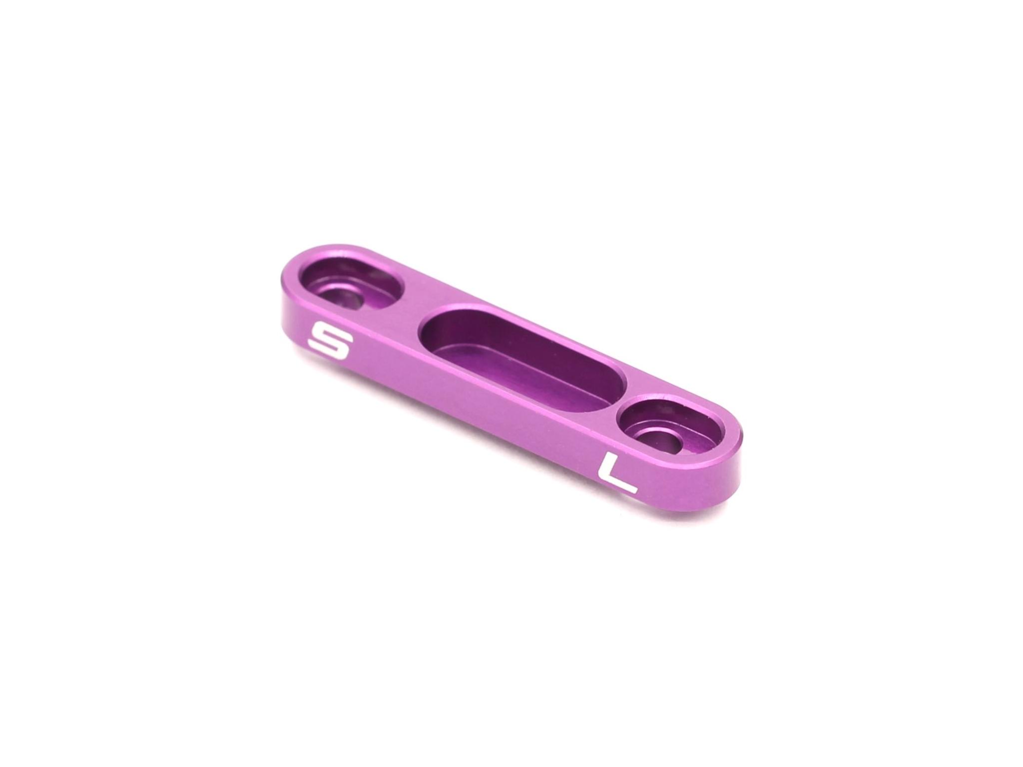 新設計グラファイトフロントロアアーム。アルミブロックの向きを変えることで、ショート/ロングホイールベース(+/-2.0mm)の調整が可能。